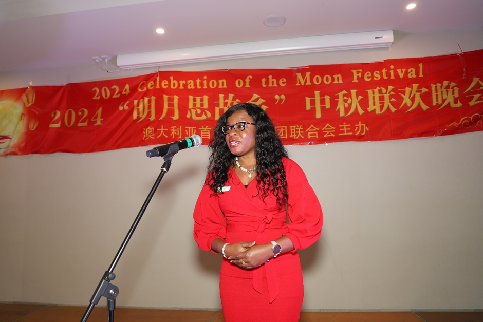 堪培拉绿党Yerrabi议员候选人加勒比海移民Soelily Consen-Lynch也发表了讲话,祝贺华人“迎中秋,庆国庆”活动圆满成功。澳大利亚首都地区工党议员Micheal Patterson MLA和Suzzane Orr MLA因参加大选竞选事务繁忙,未能参加晚会,特别发来祝贺。