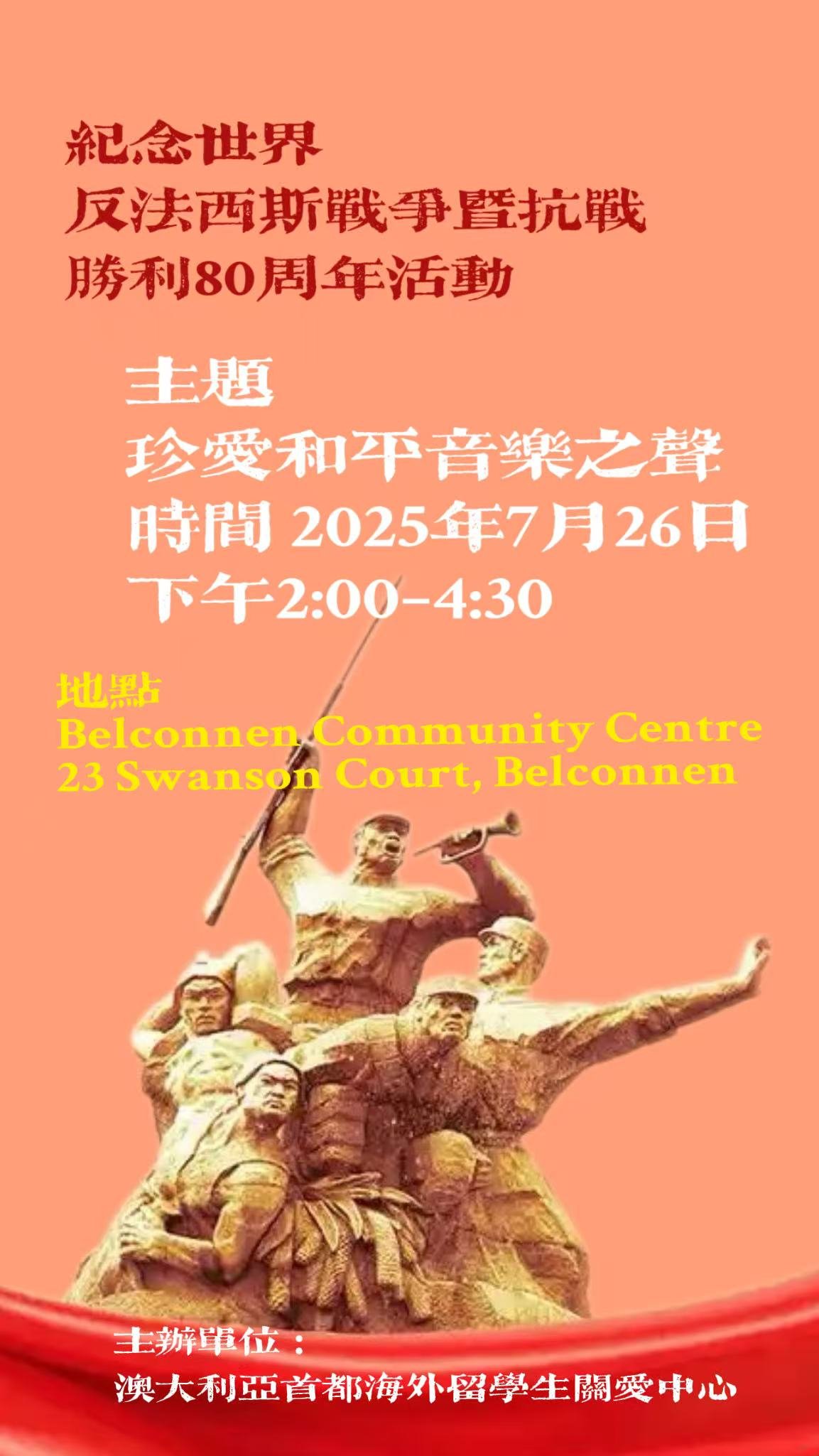 为纪念世界反法西斯战争胜利暨中国抗日战争胜利80周年,澳大利亚首都海外留学生关爱中心近日召开新闻发布会,将于2025年7月26日(星期六)下午2:00–4:30在Belconnen Community Centre(BCC)剧院(23 Swanson Court, Belconnen)举行纪念活动——“珍爱和平·音乐之声”。
